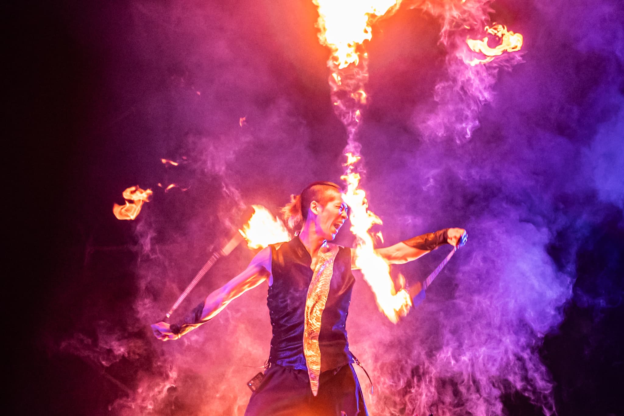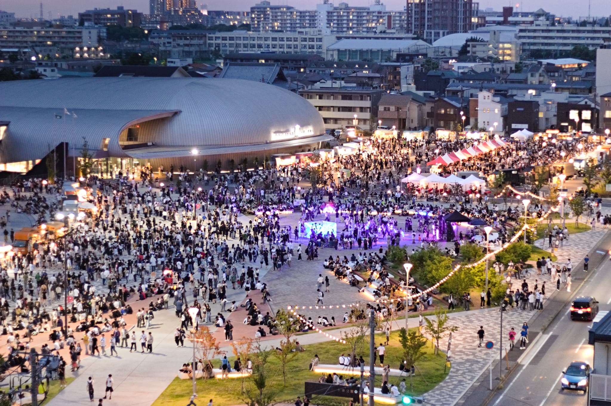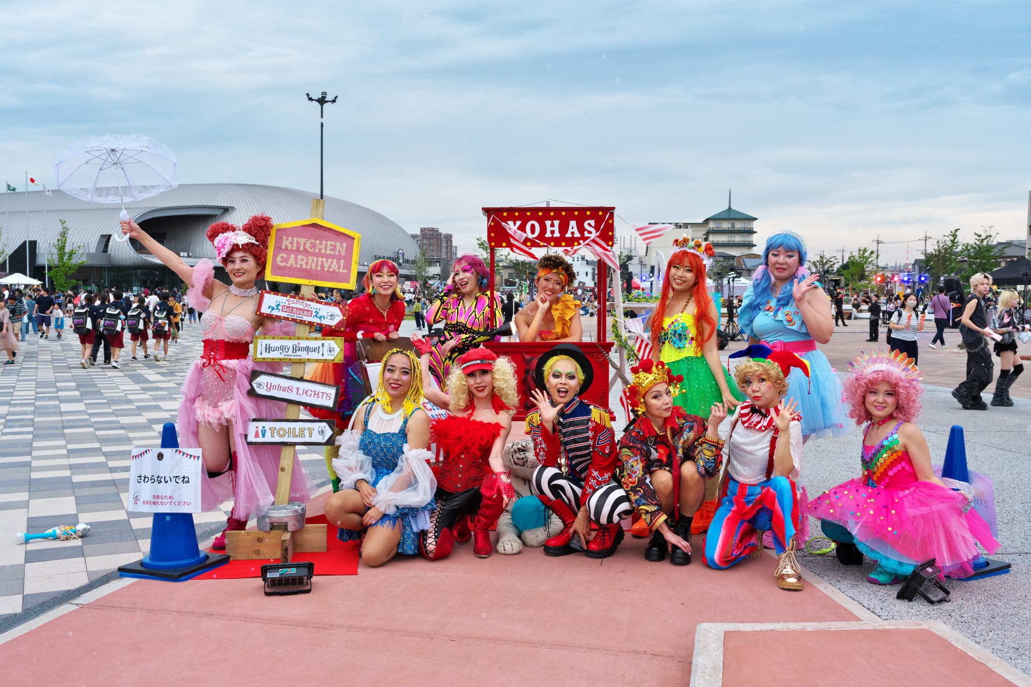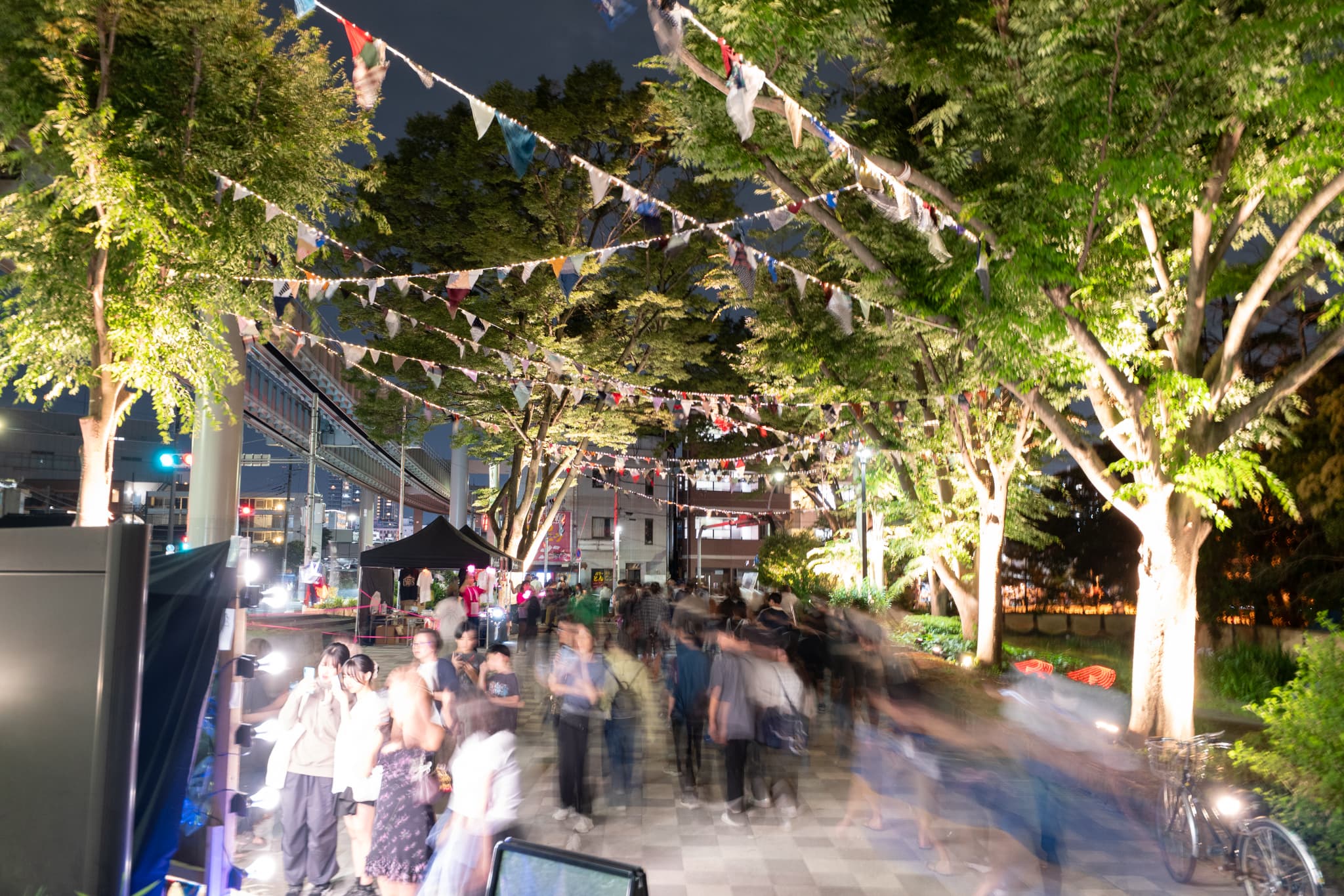 フラッグを用いたエントランスアートで「Make a CIRCUS」の世界観を表現。ライトアップされた公園内では、ファイアーパフォーマンスやデジタルサーカスショー、ミューラルアート&DJなど、光と音のパフォーマンスが繰り広げられ、夜の千葉公園を鮮やかに彩りました。